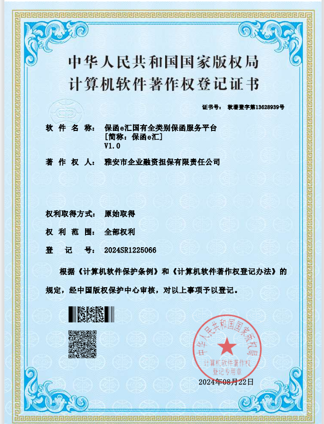 近日,由雅安市擔保公司開發(fā)完成的《保函e匯國有全類別保函服務平臺(簡稱:保函e匯)V1.0》軟件通過國家版權局的最終審查,獲得由中華人民共和國版權局頒發(fā)的計算機軟件著作權登記證書。